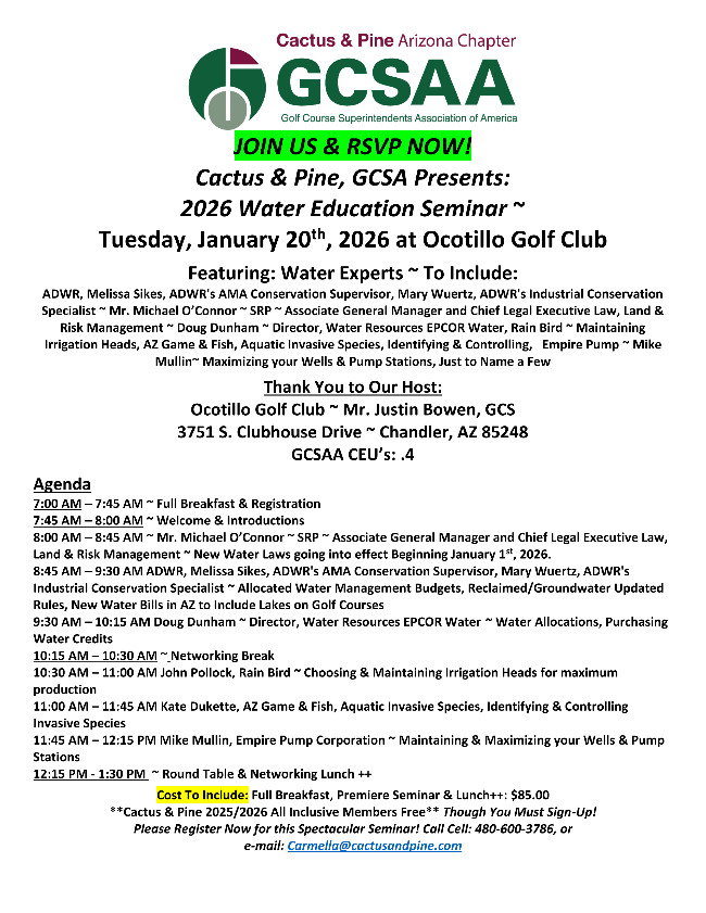 7:00 AM – 7:45 AM ~ Full Breakfast & Registration 7:45 AM – 8:00 AM ~ Welcome & Introductions 8:00 AM – 8:45 AM ~ Mr. Michael O’Connor ~ SRP ~ Associate General Manager and Chief Legal Executive Law, Land & Risk Management ~ New Water Laws going into effect Beginning January 1st, 2026